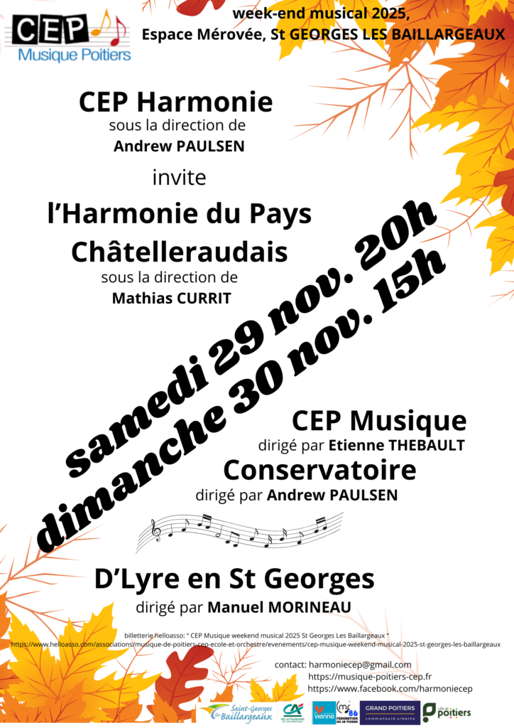 Le dimanche 30 novembre à partir de 15h00, des ensembles du CEP dirigés par Etienne THEBAULT ainsi que des formations du Conservatoire sous la direction d’Andrew PAULSEN auront pour invités D’LYRE en St GEORGES en dernière partie, sous la direction de Manuel MORINEAU.