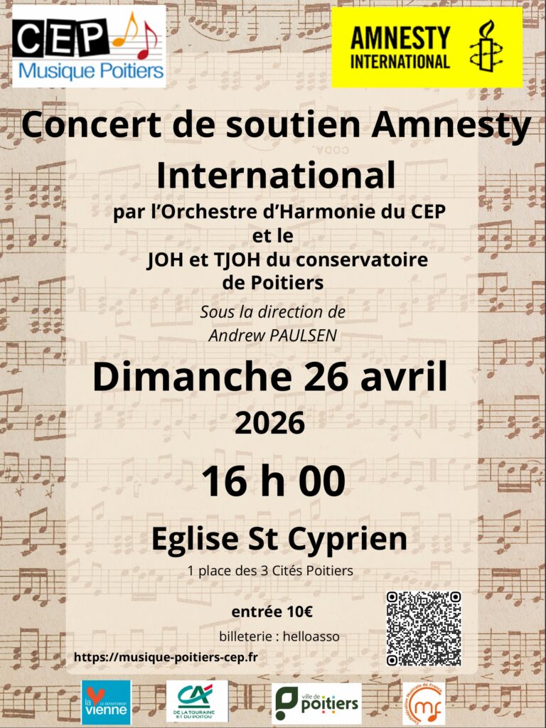 Ce concert, en partenariat avec Amnesty International Poitiers, aura lieu le Dimanche 26 Avril à 16h à l’Eglise St Cyprien.